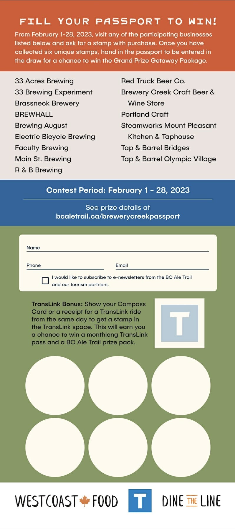 The Vancouver Brewery Creek Ale Trail Tasting Passport also feature a TransLink Bonus square. Show your Compass Card or a receipt for a TransLink ride from the same day to get a stamp in the TransLink Bonus space. This will earn you a chance to win a one-month TransLink pass and a BC Ale Trail prize pack.
