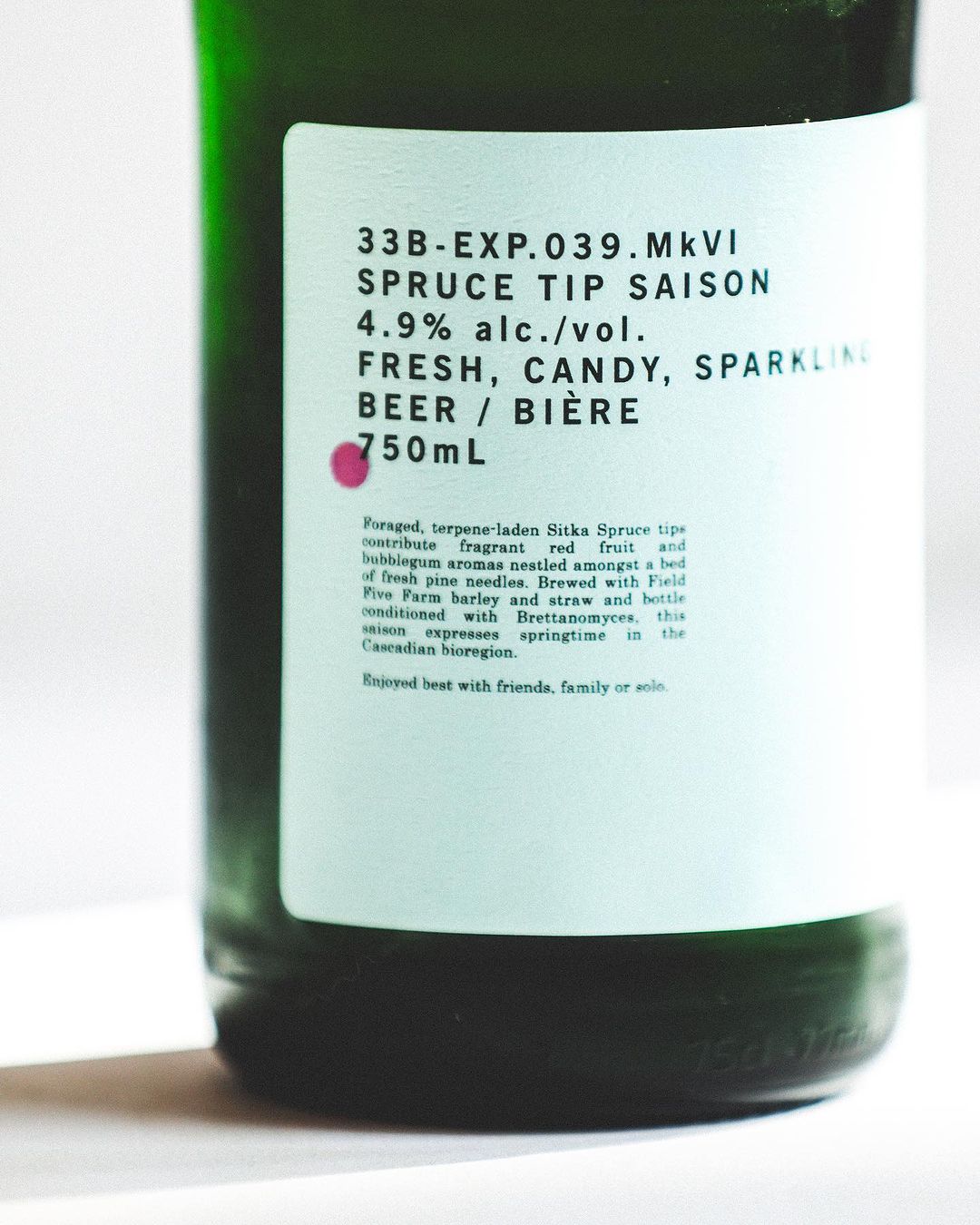 Foraged Sitka Spruce tips contribute fragrant red fruit and bubblegum aromas nestled among a bed of fresh pine needles. Brewed with Field Five Farm barley and straw, then bottle-conditioned with Brettanomyces, this Saison is an expression of the Cascadian bioregion.