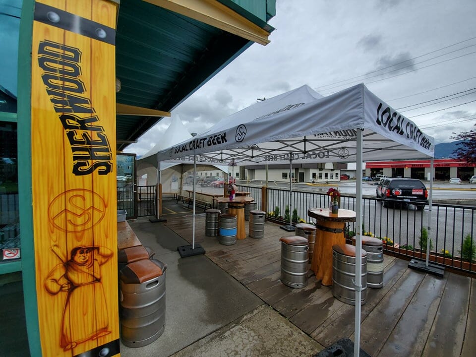 Westward in Terrace, Sherwood Mountain Brewhouse has reopened with sit-in service on their enlarged patio only. Find outside hand washing stations and a walk-up order window for fresh pints at a safe physical distance. Stay dry when those clouds roll in from off the Skeena River under Sherwood’s set-up tents.