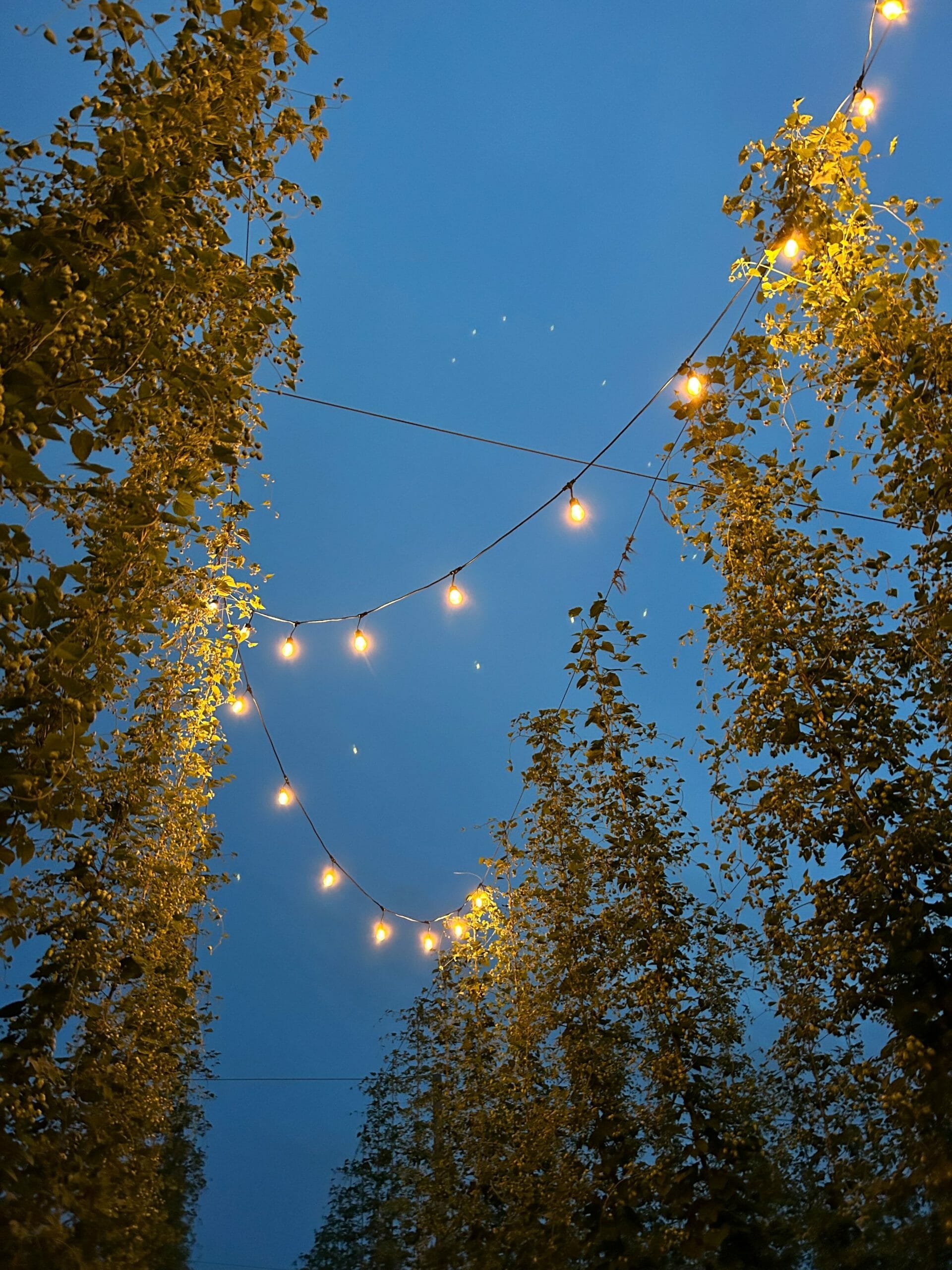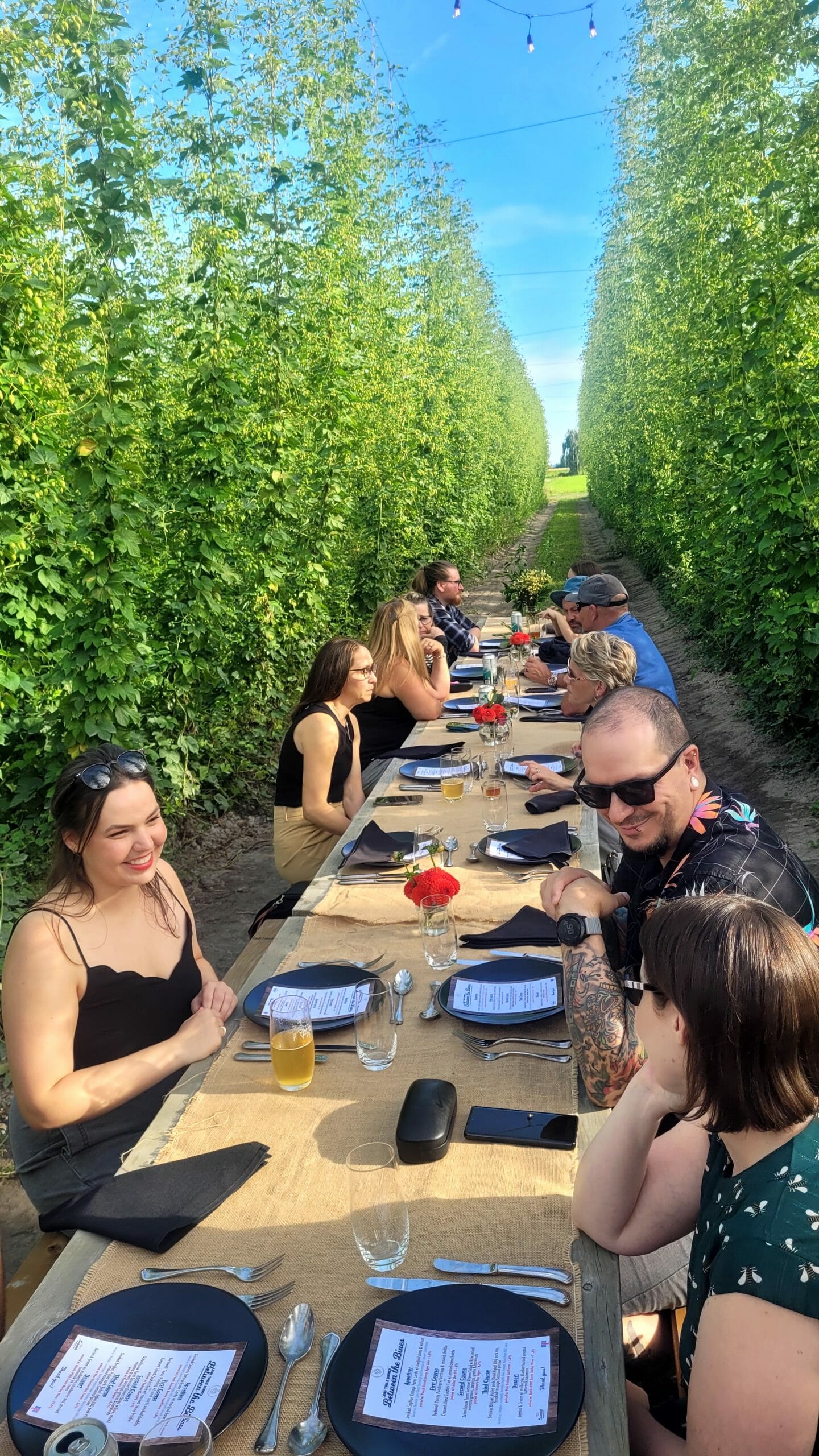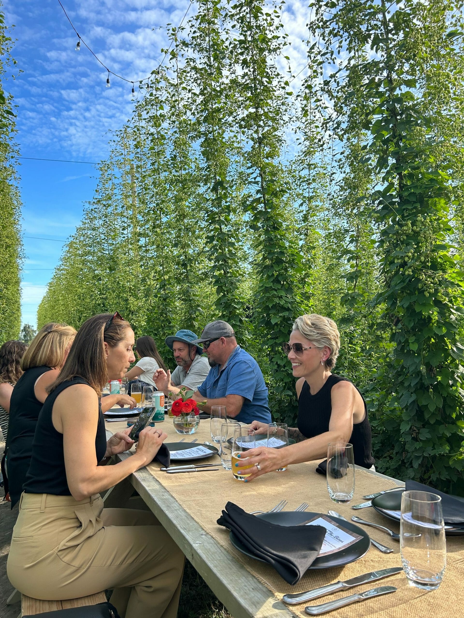 When I arrived, I was offered a choice of Barnside beers or non-alcoholic beverages (try their Roadpop Hop Water!) to enjoy while chatting on the grass alongside the hop fields. When dinner was scheduled to begin, guests were ushered to the long wooden table that had been set up between the hop bines, underneath the twinkling strands of lights criss-crossed above. It felt magical.