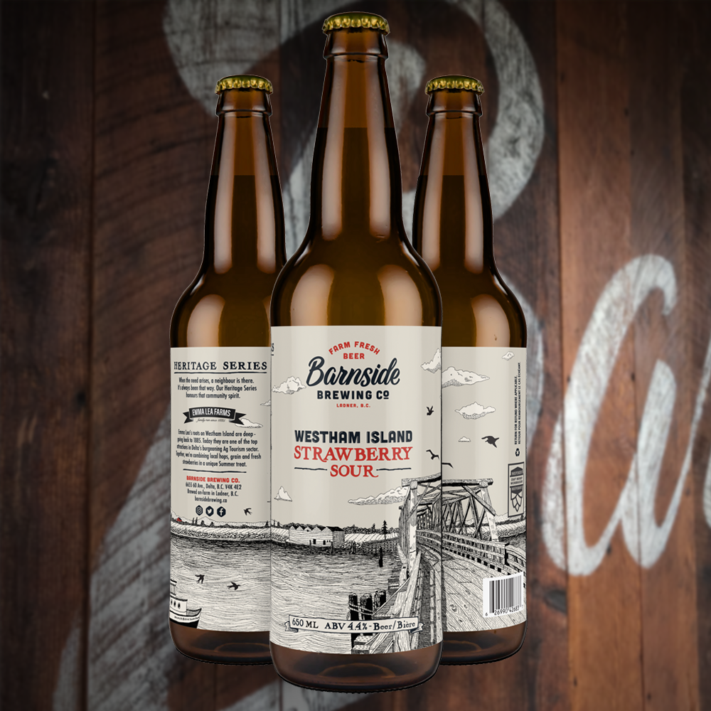 - Westham Island Strawberry Sour (4.4% ABV) This berrylicious sour ale was brewed with more than 500kg of strawberries freshly harvested from Emma Lea Farms on Westham Island.