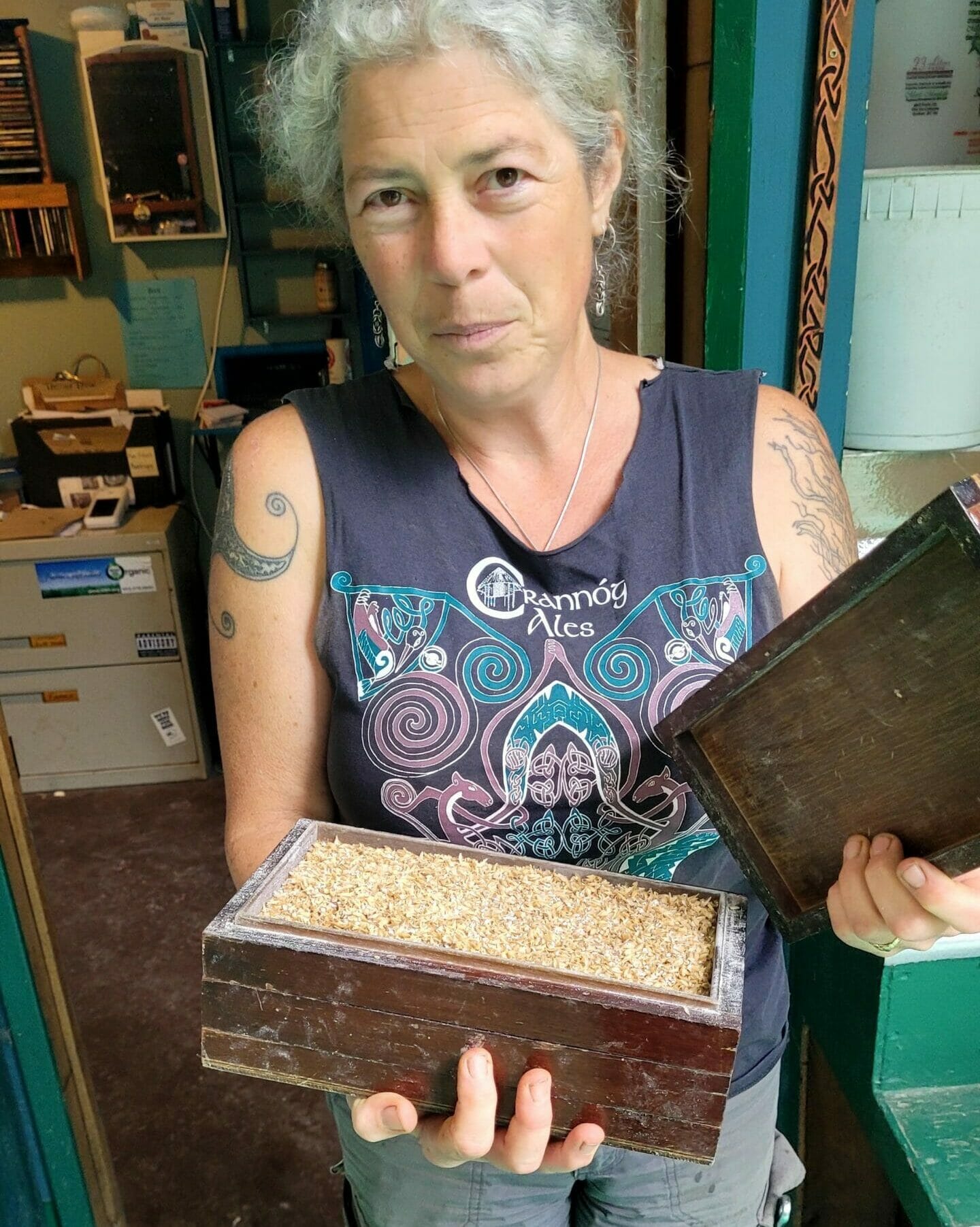 Kneen recalls John Mitchell coming to visit them shortly after the equipment was installed, bringing with him a gift: a malt sieve. The old wooden box stacked with different kinds of screens helps the brewer figure out what percentage of their milled malt is at each level of coarseness or fineness. Kneen still has the malt sieve and uses it regularly. She recalls Mitchell visiting several times after that to try the beer and observe the brewing process. He was, unsurprisingly, very pleased that Crannóg also uses whole hops — something about which Mitchell was passionate.